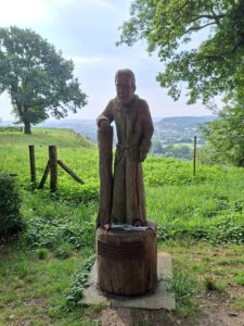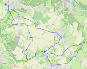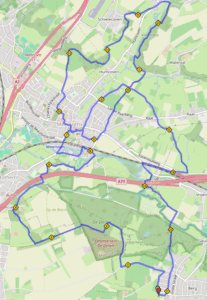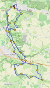 Zodra we Bergen uit zijn lopen we door het bos, met veel korte hellingen en dalingen. Onderweg wordt ik aangesproken door iemand. Gelukkig helpt hij mij op weg want ik herken hem niet. Het Blijkt Toon Cornelissen te zijn een oud collega. We hebben samen stage gelopen in de elektronische werkplaats in Dongen. Hij bleef daar werken en ik ben na een jaar ook daar in dienst getreden. Onderweg vele herinneringen opgehaald. Via Vilt komen we in Valkenburg aan. Waar we bij het Shimano Experience Center de eerste pauze is. Na een kop koffie lopen we door langs de geul. Het is vrij vlak en een verademing na de klimpartijen voor Valkenburg. Uiteindelijk komen we uit bij de kruisweg op de Schaelsberg. Vanuit de Schaelsberg is een mooi uitzicht over het Limburgse landschap. Op de terug weg komen we weer bij het Shimano Experience Center voor de tweede pauze. Daarna lopen we weer terug naar bergen door het Kloosterbosch. Voor we in Bergen moeten we nog wel behoorlijk klimmen.